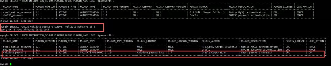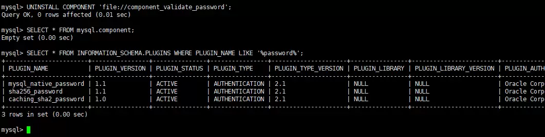 mysql> SELECT * FROM INFORMATION_SCHEMA.PLUGINS WHERE PLUGIN_NAME LIKE '%password%';