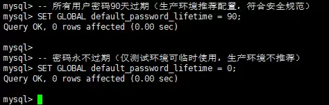 密码过期功能并非validate_password插件提供,而是MySQL自带的内置机制。它既支持全局统一设置所有用户的密码有效期,也允许为单个用户进行个性化配置。下面结合两个真实使用场景,分享具体操作。