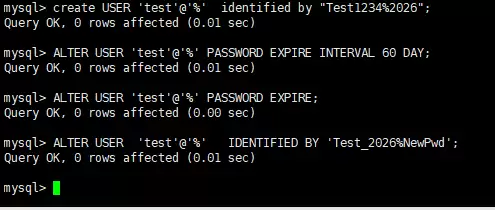 ALTER USER 'test'@'%' IDENTIFIED BY 'Test_2026%NewPwd';