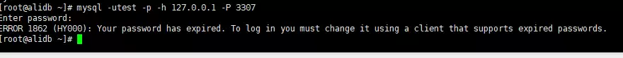 ERROR 1862 (HY000): Your password has expired. To log in you must change it using a client that supports expired passwords.