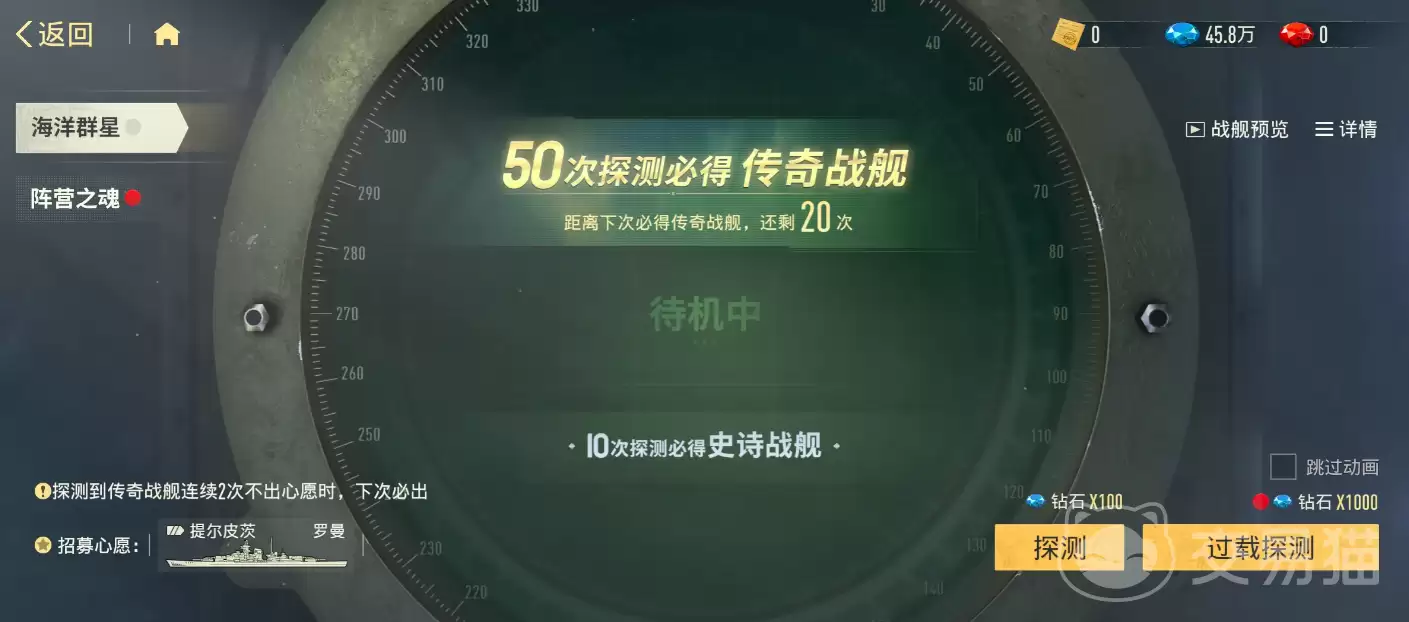 首先来看“海洋群星”探测池。这个池子涵盖了从普通战舰到传奇战舰的广泛范围,其最大的特色在于引入了“心愿锁定”机制。简单来说,玩家可以提前在招募心愿中设定一艘心仪的传奇战舰作为目标。如果连续两次探测都没有抽到这艘船,那么第三次探测必定将其收入囊中。这相当于为你的终极目标增加了一层强有力的定向保险。