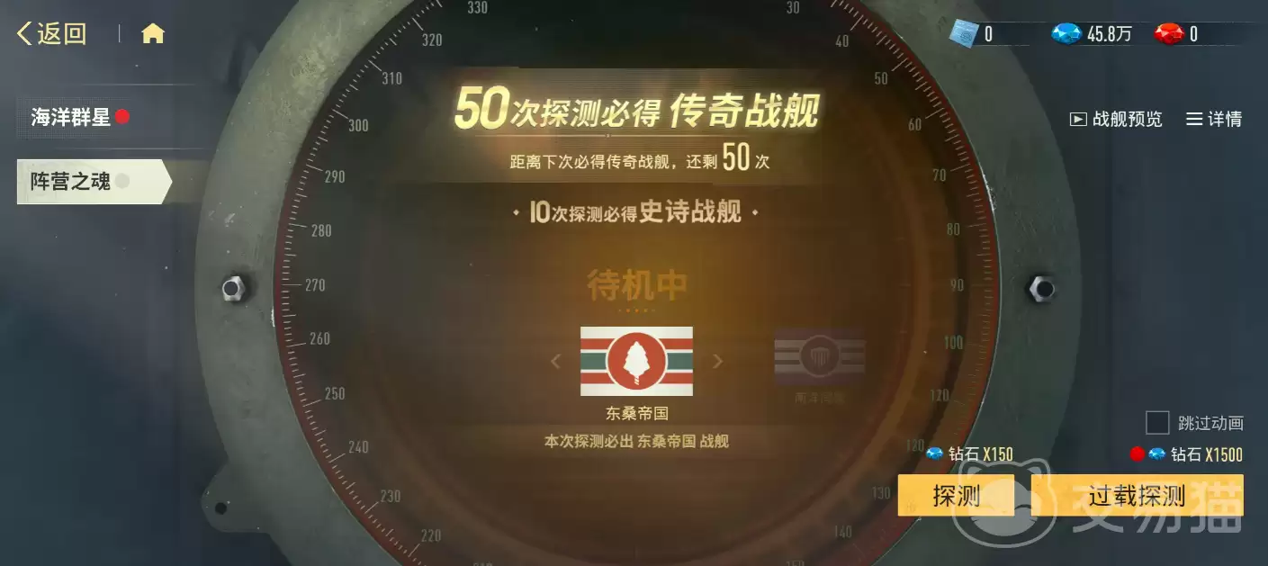 “阵营之魂”同样遵循50次探测必出传奇战舰的保底策略。不过,其单次常规探测的成本稍高,需要150蓝钻,对应的过载探测则为1500蓝钻。这里需要特别留意的是,“阵营密函”是专用于此池的探测资源。