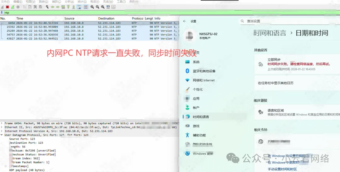 当路线是「专线光猫 → 公司路由 → 交换机 → 电脑」时,NTP同步失败;