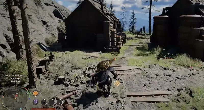 抵达这片木屋区域后,请径直走向右侧的那间独立木屋。