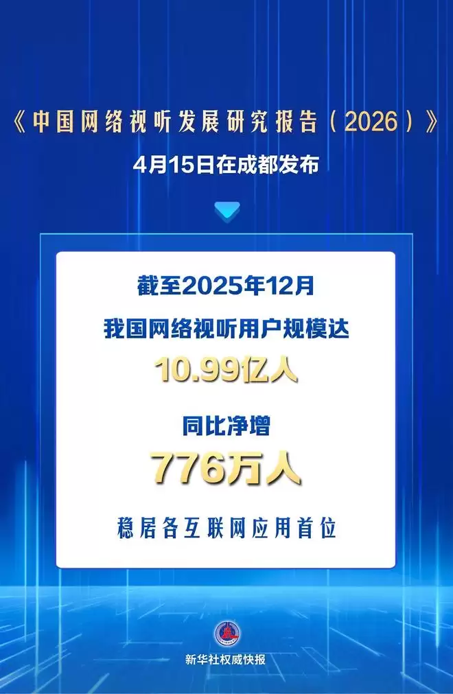 网络视听用户规模近11亿,稳居互联网应用首位 4月15日,第13届中国网络视听大会在成都隆重召开。大会现场发布的《中国网络视听发展研究报告(2026)》披露了行业最新核心数据。 报告数据显示,截至2025年12月,我国网络视听用户总规模已高达10 99亿人。这一用户体量意味着,在过去一年中,用户数量