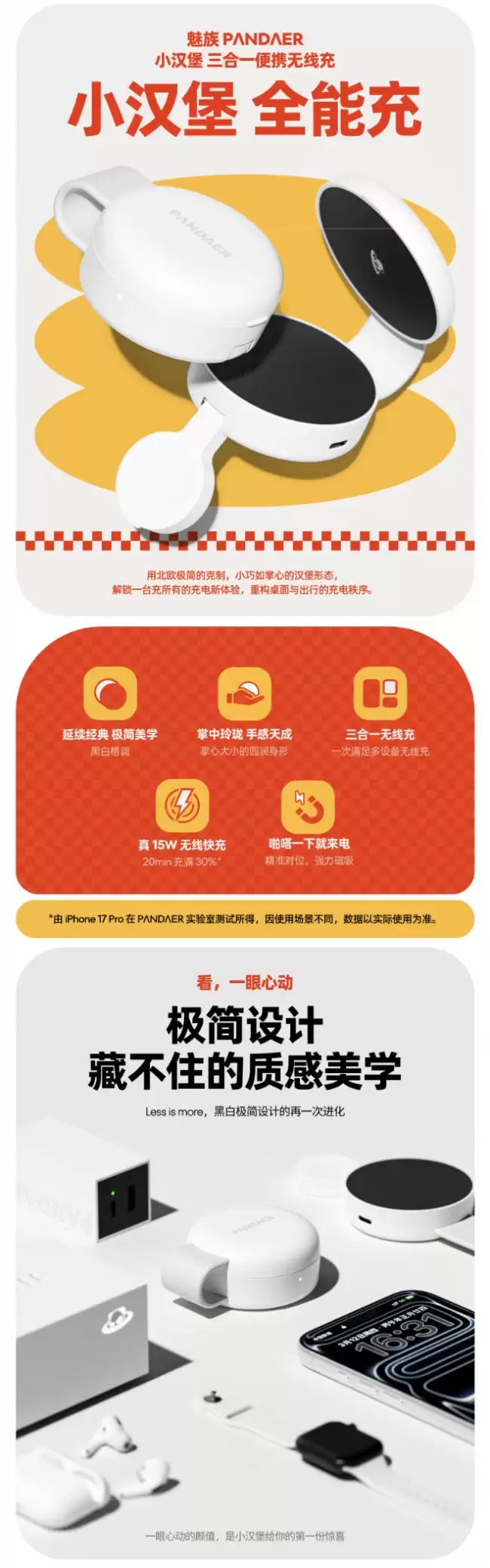 魅族推出 PANDAER 小汉堡三合一便携无线充:支持苹果 iPhone 15W 充电 首发价 189 元