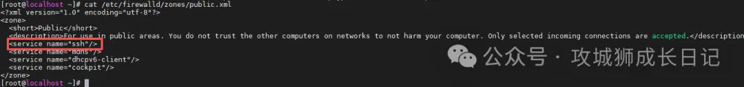 虽然默认配置确实放通了“ssh”服务,但忽略了一个关键事实:firewalld中定义的“ssh”服务,默认只放行22端口。其配置本质是这样的: