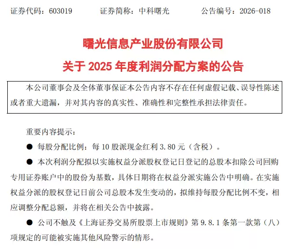 中科曙光2025年净利同比增长13.87% 拟每10股派3.8元