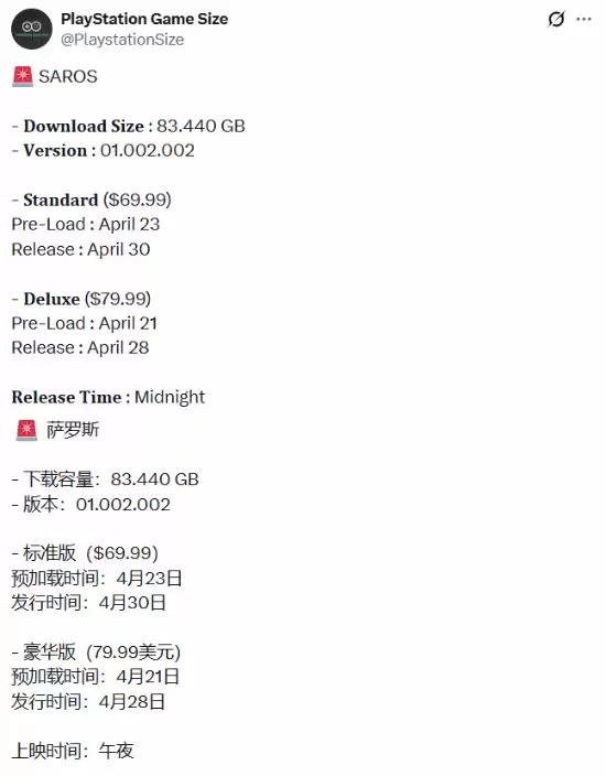 游戏尚未正式发售,其庞大的内容体量已引发广泛关注。根据专注追踪PlayStation游戏数据的知名博主PlayStation Game Size最新情报,《沙罗周期》的预载容量已达到惊人的83GB,当前版本号为01.002.002。这一庞大的游戏体积意味着什么?它强烈暗示本作将包含极其丰富的游戏内容、高品质的视听素材以及可能广阔的开放世界或深度剧情,无疑对玩家PS5主机的存储空间提出了更高要求。