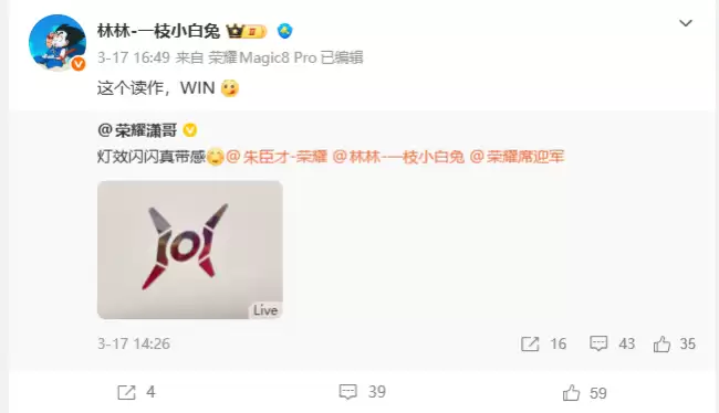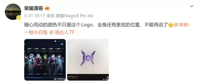 几天后的3月17日,@荣耀潇哥晒出了游戏本的局部灯效,配文简洁却充满感染力:“灯效闪闪真带感”。