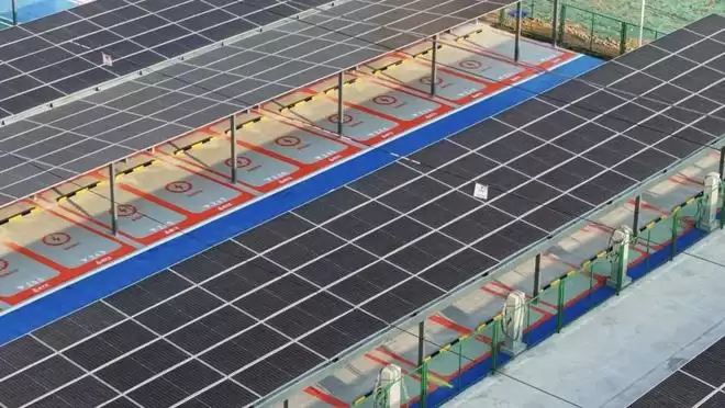 该充电站总占地面积约4.79万平方米,相当于六个标准足球场的大小。在这片开阔的场地上,可支持近百辆新能源汽车同时进行高效充电。尤为引人注目的是,覆盖全场300多个停车位的,是整齐划一、具备发电功能的光伏智慧车棚。