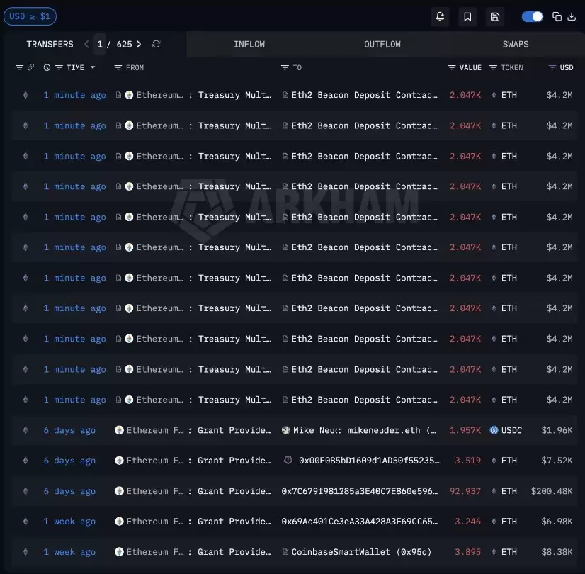 具体来看,就在本周一,基金会的财政多重签名钱&包向以太坊信标链存款合约发起了11笔交易。每笔存入约2,047个以太币,按当时2,073美元的价格计算,这笔操作共涉及22,517枚ETH,总价值约4620万美元。根据Arkham Intelligence的数据,这是该基金会迄今为止规模最大的一笔质押部署。