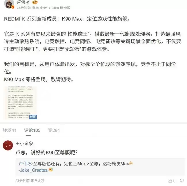 小米卢伟冰REDMI K90 至尊版定位在 Max 之上