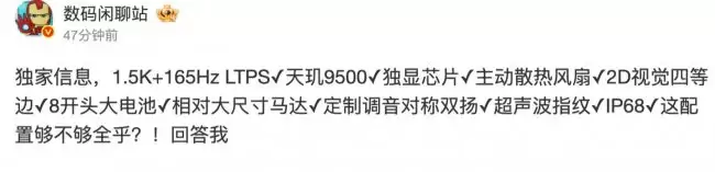 关于配置,另一位爆料常客 @数码闲聊站 此前也有过剧透。他称某厂的天玑 9500 新机将配备一块 1.5K 分辨率、165Hz 刷新率的 LTPS 屏幕,采用2D视觉四等边设计。核心配置上,除了独显芯片和主动散热风扇,还配备了“8”字开头的大容量电池、相对大尺寸的振动马达、定制调音的对称式双扬声器,以及超声波屏下指纹。值得注意的是,旗舰机常见的IP68级防尘防水也没有缺席。