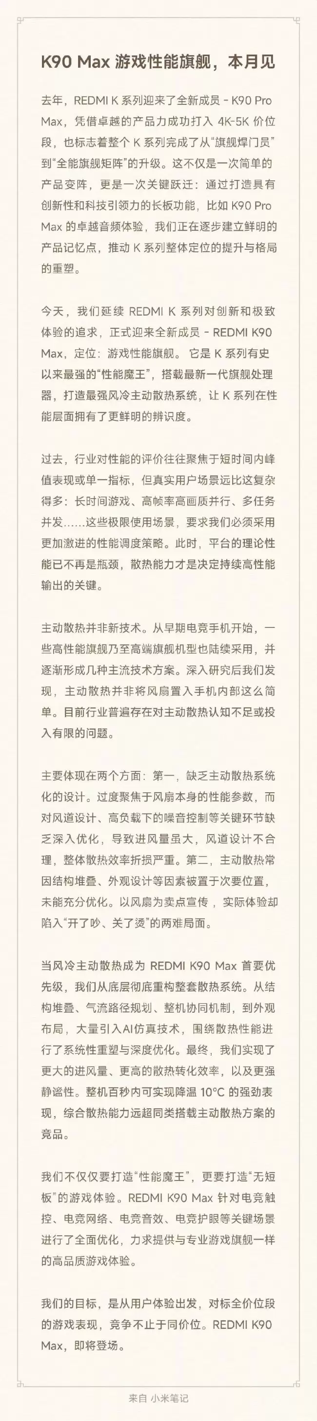 4 月 7 日,REDMI K90 Max 正式官宣,小米集团创始人雷军亲自转发,强调该机是 “性能魔王”。小米合伙人卢伟冰补充,这是 K 系列史上最强性能旗舰,内置风冷主动散热、165Hz 超高刷