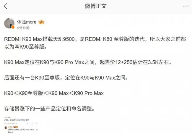 值得玩味的是,卢伟冰在微博中还透露了一个重要信息:REDMI K90 至尊版也依然存在。并且明确了一个定位关系:Max > 至尊。所以,这场发布会,将由Max版率先登场。