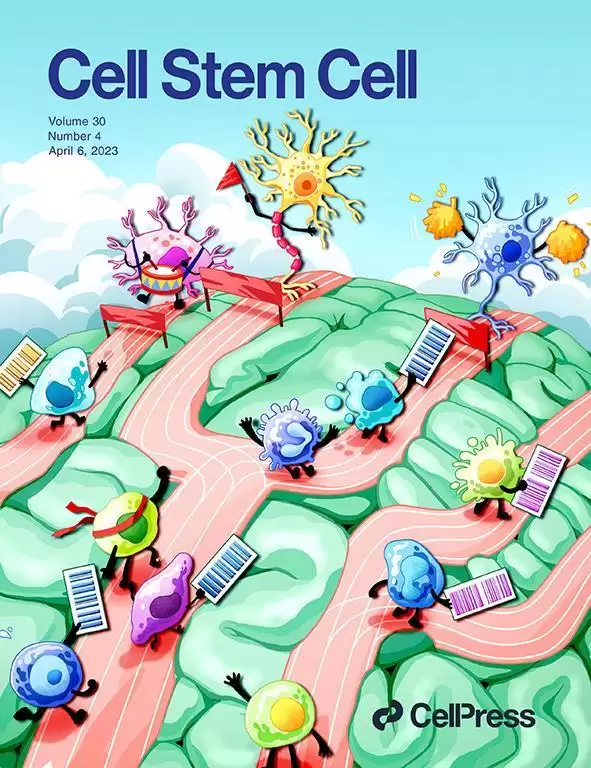 2024年3月,陈跃军团队的一篇论文,在干细胞顶刊《Cell Stem Cell》发表并登上封面。极具辨识度的封面设计,形象地呈现了这一成果的精髓:一个个手持条形码的神经细胞,正沿着分叉的跑道奔向各自的分化终点,而这些“条形码”就象征着陈跃军研发的细胞谱系示踪技术SISBAR。
