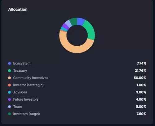关于代币本身,官方明确设定了10亿枚的固定总量,且无增发计划。代币分配高度倾向社区与生态:社区占50%,生态系统占19.5%,国库占10%,其余部分分配给投资者、团队和顾问。其中,团队、投资者及顾问的代币有12个月锁定期,之后分24个月线性释放。