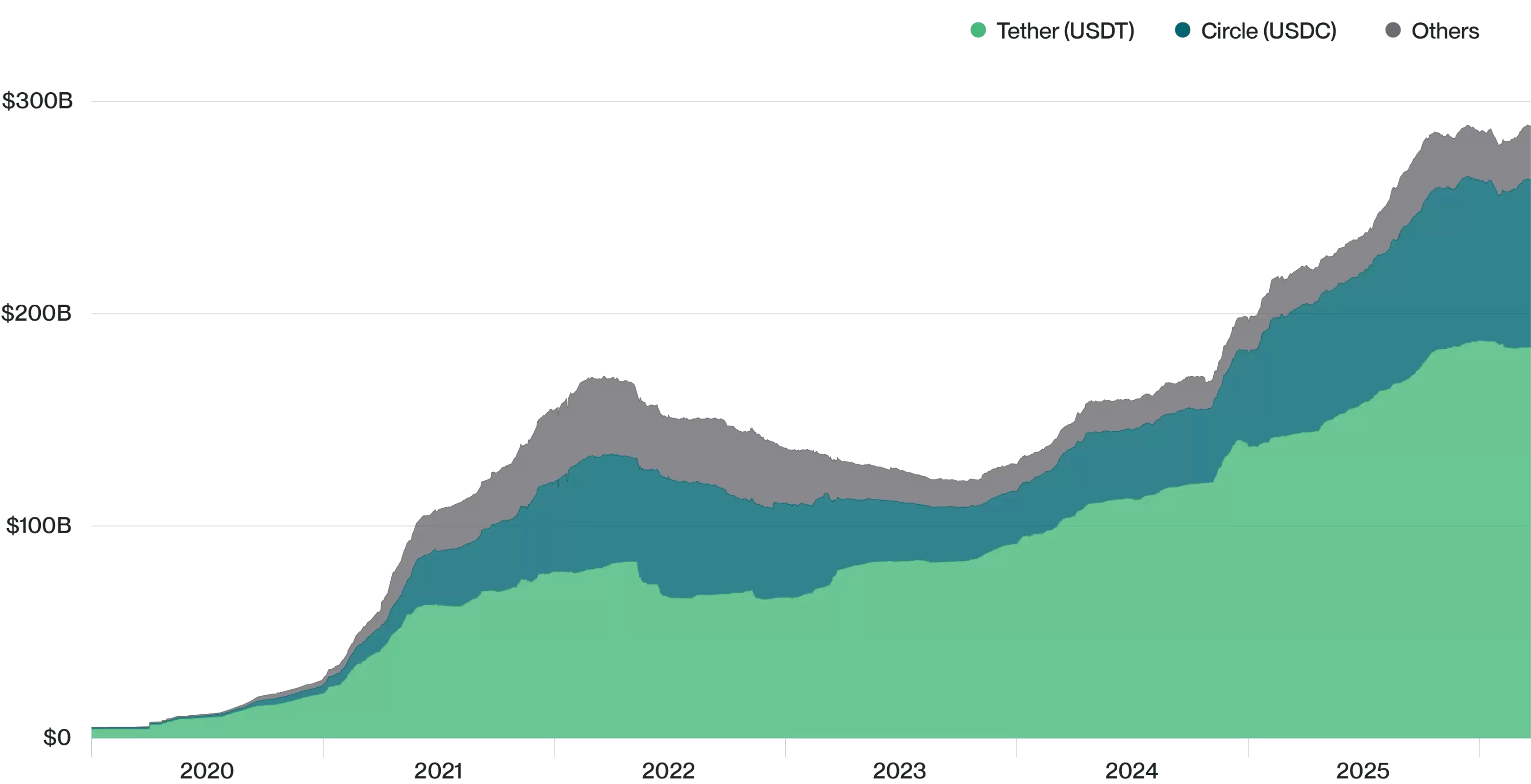 来源:Bitwise Asset Management,数据来自 The Block。数据覆盖时间:2020 年 1 月 1 日至 2026 年 3 月 23 日。注:「其他」包括 BUSD、crvUSD、DAI、FDUSD、FEI、FRAX、GHO、GUSD、LUSD、MIM、PYUSD、TUSD、USDD、USDe、USDP 及 USDS。