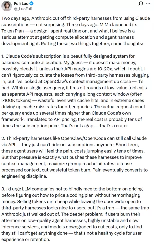罗福莉的思考,主要由Anthropic几天前切断Claude第三方工具订阅通道一事触发。无独有偶,MiMo也在近期推出了自家的Token Plan,这让她对行业现状有了更深的感触。她的核心观点可以归结为以下几方面: