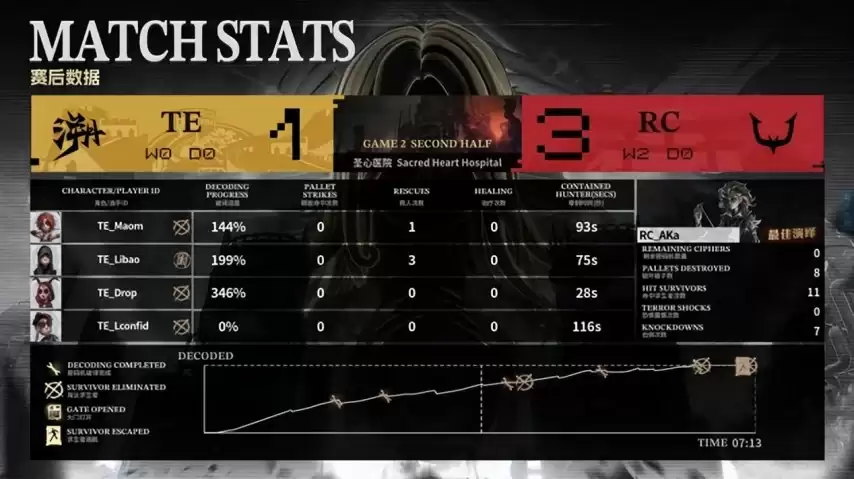 最终,RC战队以总比分13:4战胜TE战队,豪取2胜0平0负的优异战绩,赢得了这场COA9小组赛的关键胜利。纵观整场比赛,RC战队无论是在监管者的运营思路、节奏把控,还是在求生者方的团队协作与临场决策上,都展现出了更为成熟和高效的执行力。