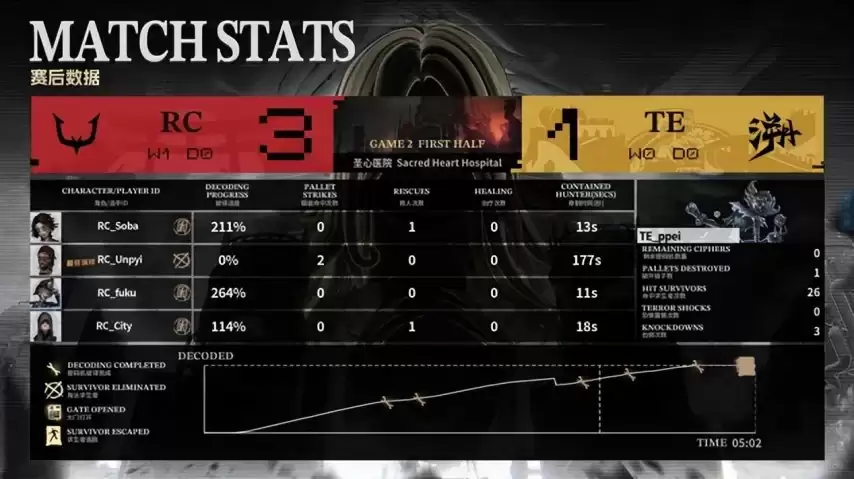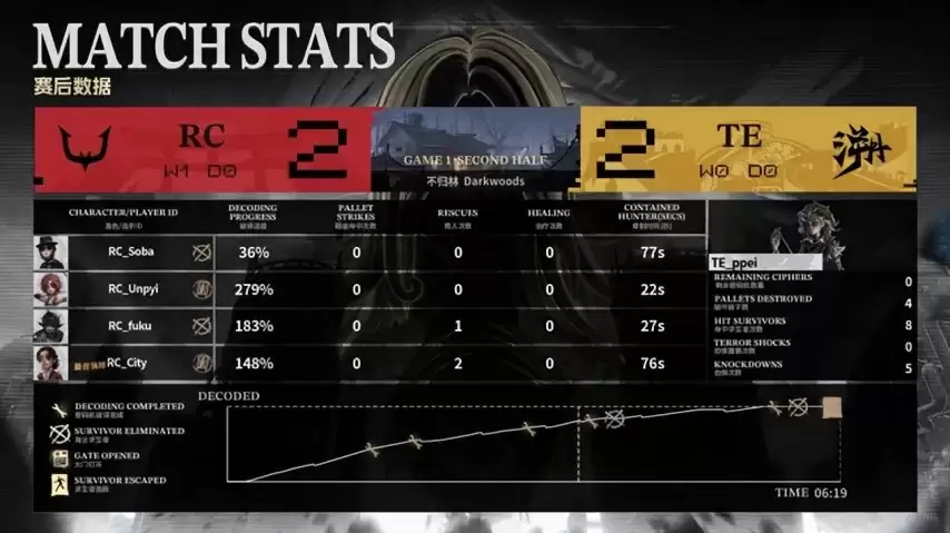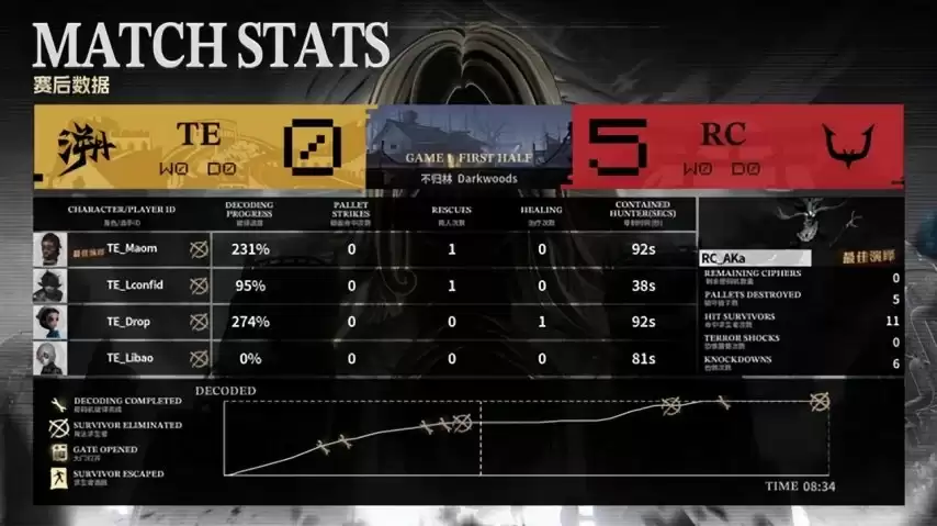 在阵容选择上,TE求生者方拿出了医生、飞行家、守墓人与咒术师的组合;RC监管者AKa则果断选出时空之影。双方的禁用角色极具针对性:TE选择封锁先知、大副、幻灯师以及气象学家。