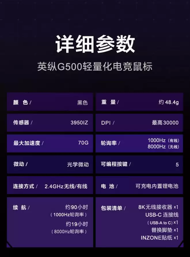 以下是这款INZONE G500 FNC联名电竞鼠标的详细规格参数: