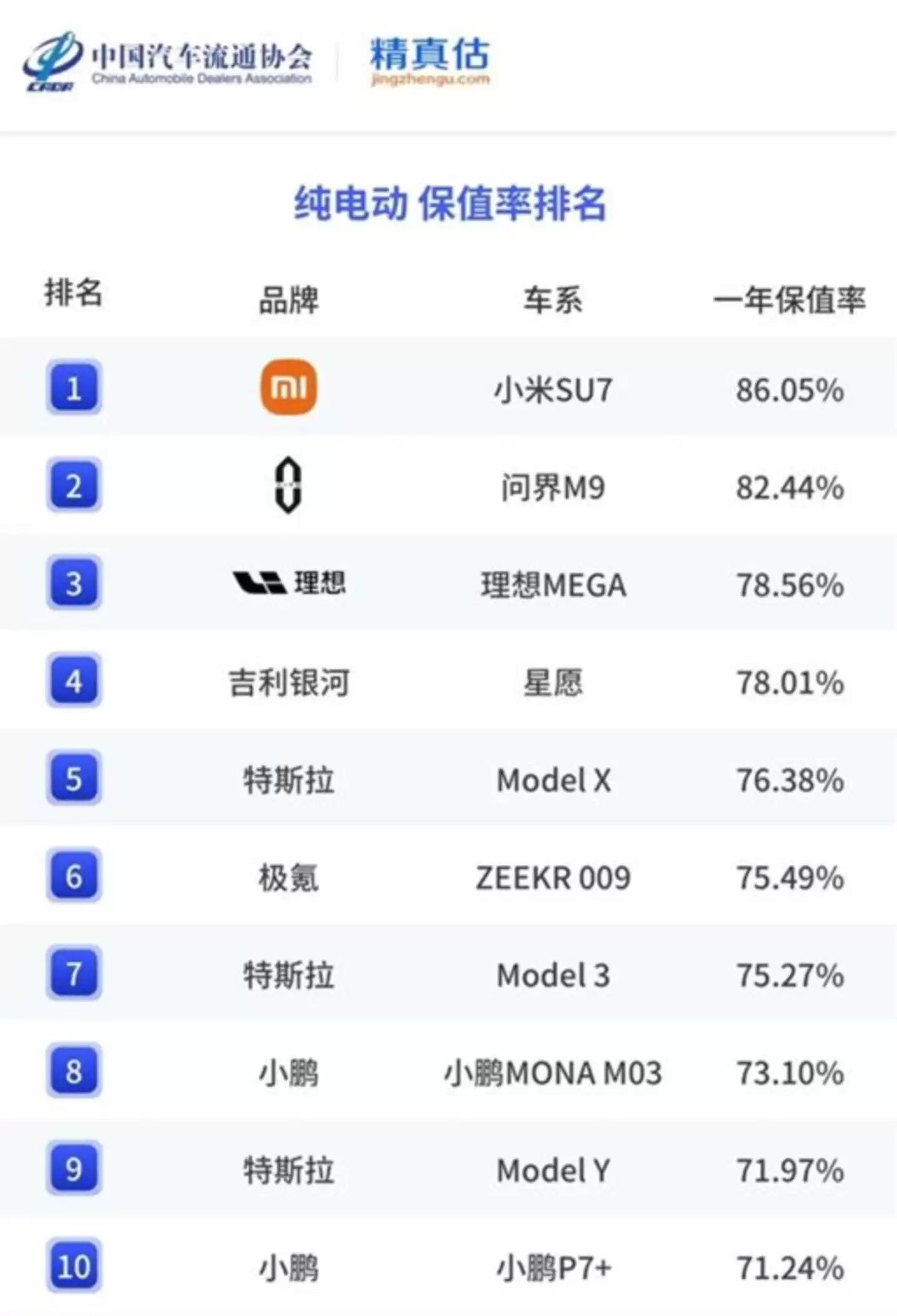 根据中国汽车流通协会与精真估联合发布的《2025年度中国汽车保值率报告》,答案很清晰。在纯电车型中,小米SU7以86.05%的一年保值率位居榜首,问界M9和理想MEGA紧随其后,保值率分别为82.44%和78.56%。