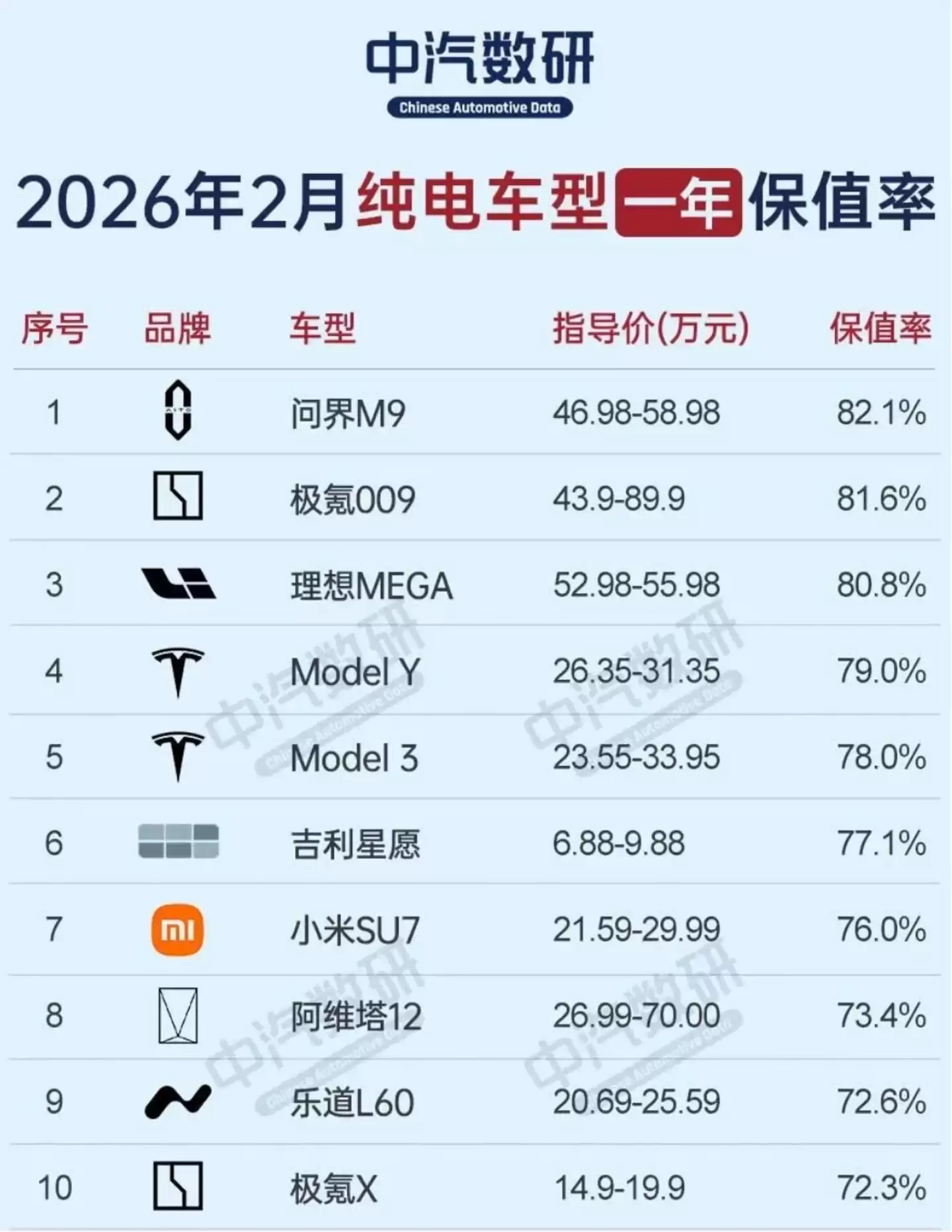 图/2026年2月纯电车型1年保值率排行 来源/中汽数研 新能源观截图