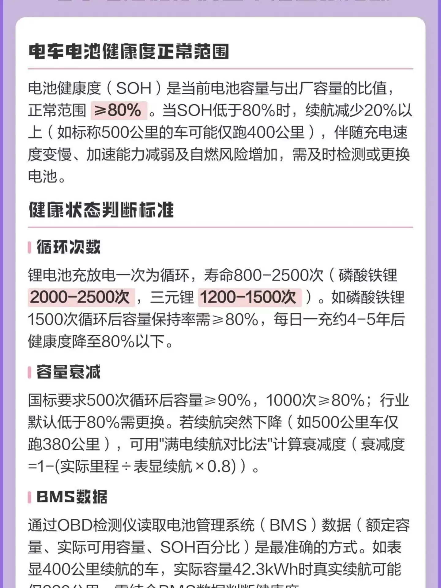 通俗点理解,SOH可以类比成手机电池的健康度。新手机电池健康度100%,用两年可能掉到80%,这时候你就会明显感觉续航“缩水”了。电动车的动力电池,道理一模一样。