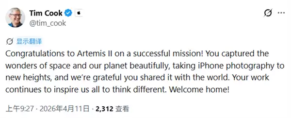 苹果CEO库克祝贺阿尔忒弥斯2号任务成功!将iPhone摄影带到全新高度