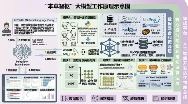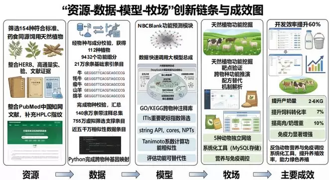 然而,蓝图在手,挑战犹存。领域内长期存在数据分散、关联复杂、知识挖掘困难等困境。为此,研究团队构建了一个基石性的工程——中国饲用天然植物活性物质数据库(NBCBank)。这个数据库的创新之处在于其“五位一体”的融合架构,将“天然植物-活性成分-作用靶标-分子功能-养殖效能”系统性地串联起来。它整合了154种植物、超过8000种活性成分、8525个分子靶标以及5800余万条结构化数据。值得一提的是,其中超过80%的反刍动物专用分子互作信息,属于全球首次实现规模化、标准化的收录,填补了该领域的关键空白。
