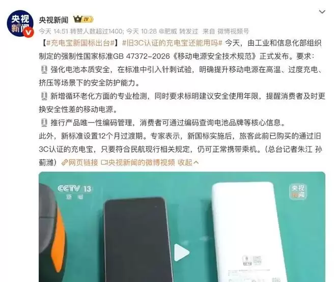 移动电源新国标落地,行业安全准绳再提升 近日,一则关乎所有消费者日常用电安全的消息正式落地。工业和信息化部会同有关部门制定的强制性国家标准《移动电源安全技术规范》(GB 47372—2026)正式对外公布,并将于2027年4月1日起正式实施。这意味着,移动电源产品的安全门槛将迎来一次系统性的全面升级