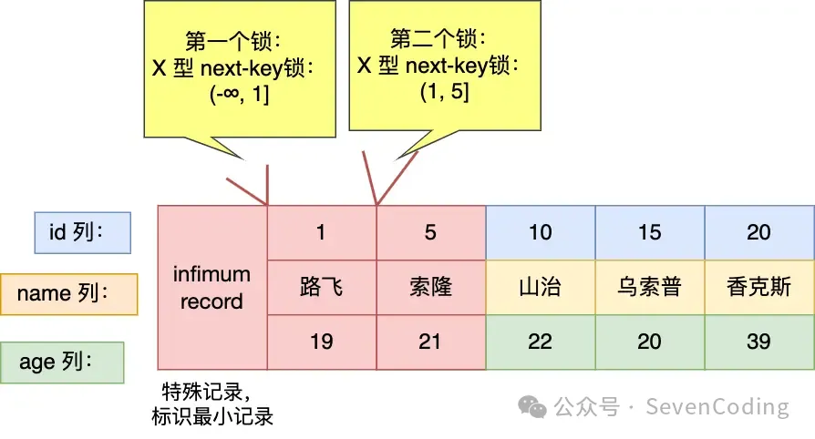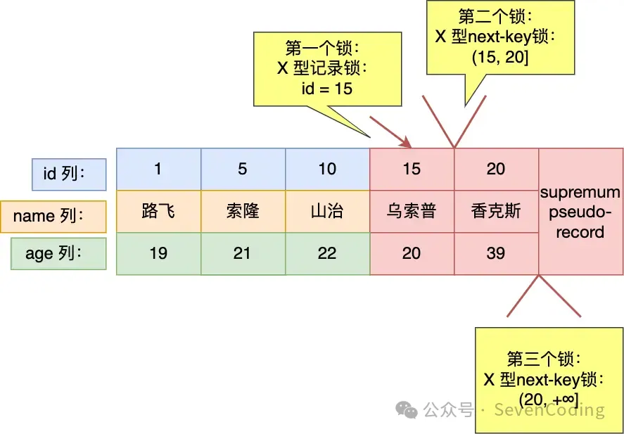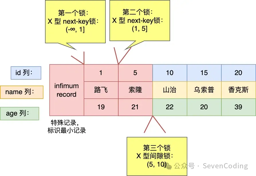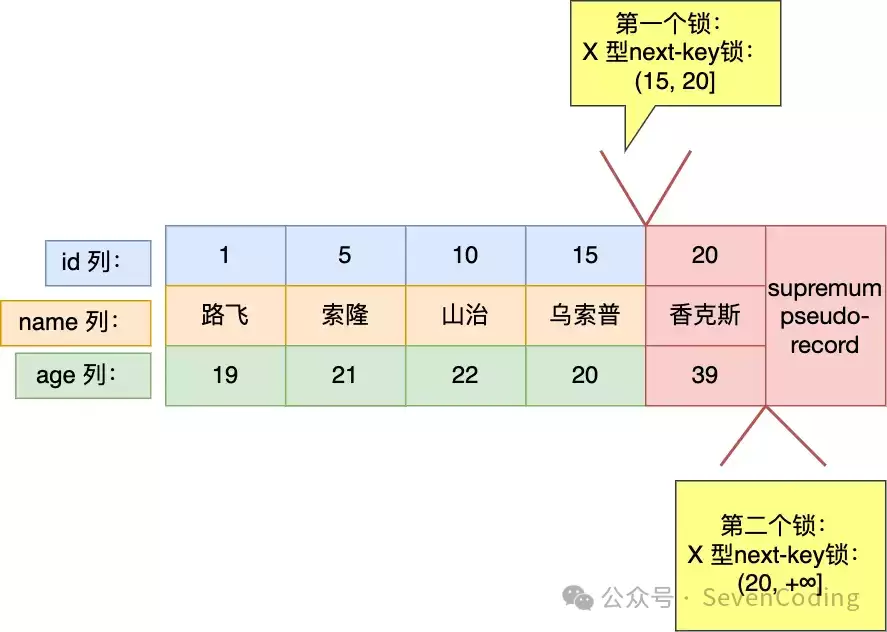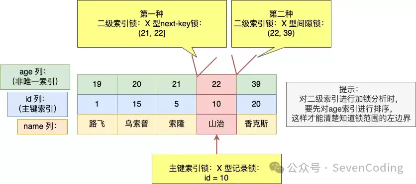 - 插入 age=22:如果插入 id=3, age=22,其下一条记录是 (id=10, age=22),该记录未被加锁,可以插入。如果插入 id=12, age=22,其下一条记录是 (id=20, age=39),该记录被加了间隙锁,插入被阻塞。