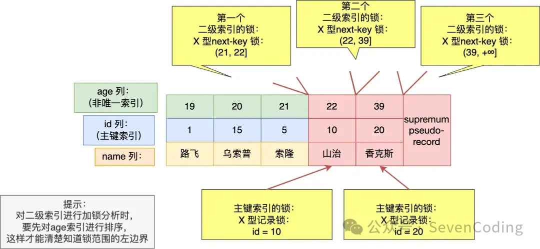 同样地,插入 age=21 或 22 的记录是否成功,也取决于其主键 id 值,原理与前述相同。