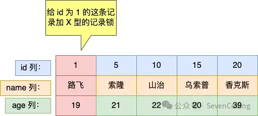 那么,事务 A 会为 id=1 的这条记录加上 X 型(排他)的记录锁。
