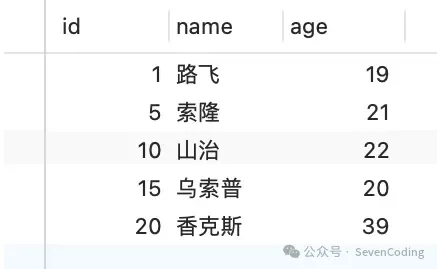 为了便于后续分析,我们假设有这样一张用户表:id 是主键(唯一索引),age 是普通索引(非唯一索引),name 是普通列。表中的初始数据如下图所示: