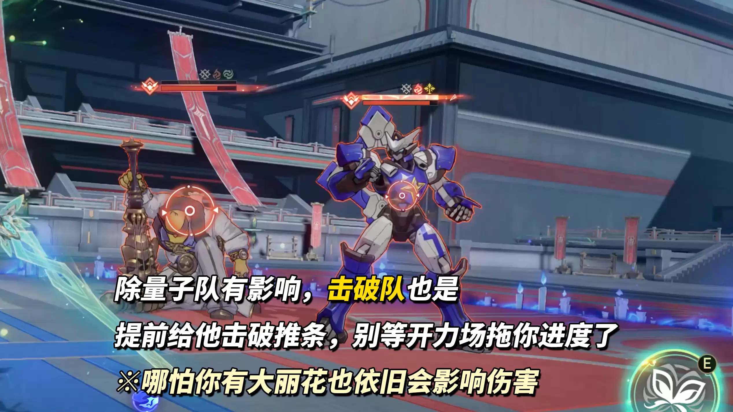 第一波敌人处理,“破晓战队·苍翼”将在其第二次行动时展开力场,效果为锁定弱点、受到量子伤害立即行动并获得输出强化。通过7次攻击可破除该力场,破除后其将陷入30%易伤状态,量子抗性也从80%降至40%。