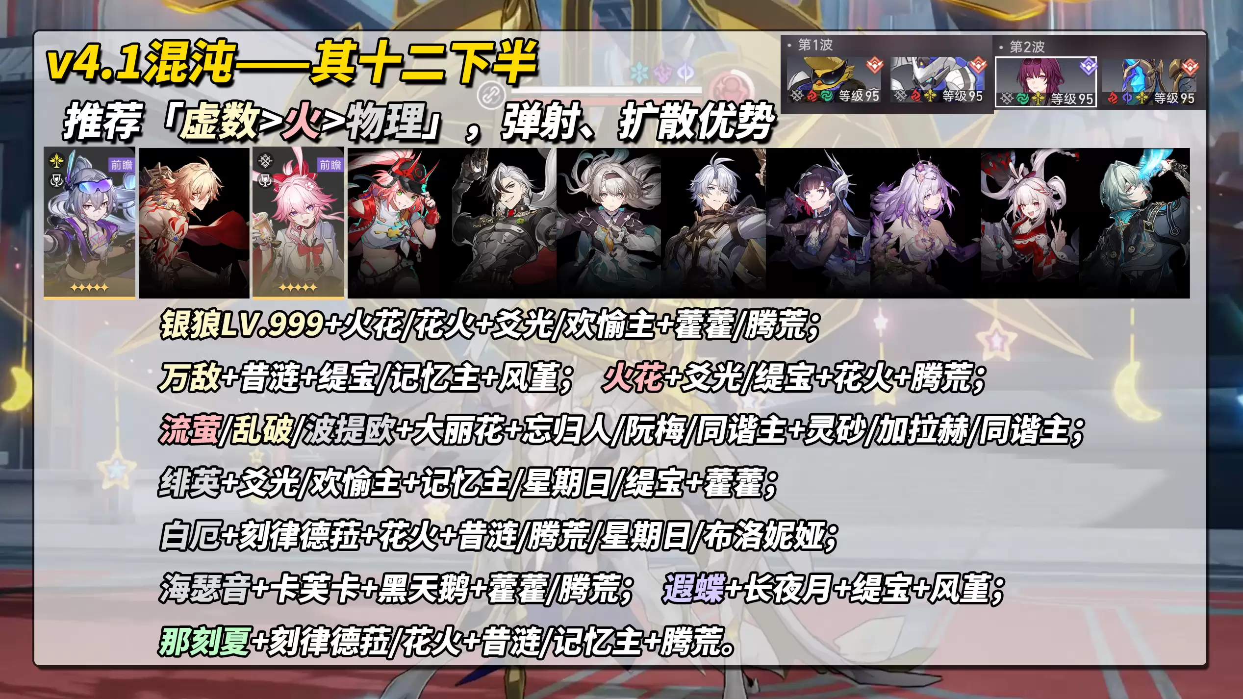 优势属性为「虚数>火>物理」。在队伍类型上,具备弹射或扩散伤害能力的队伍表现更为出色。需特别注意,“破晓战队·苍翼”拥有80%的量子属性抗性,而“卡芙卡”则具备40%的雷属性抗性。若计划使用量子或雷属性主C,需额外评估自身练度是否足够。