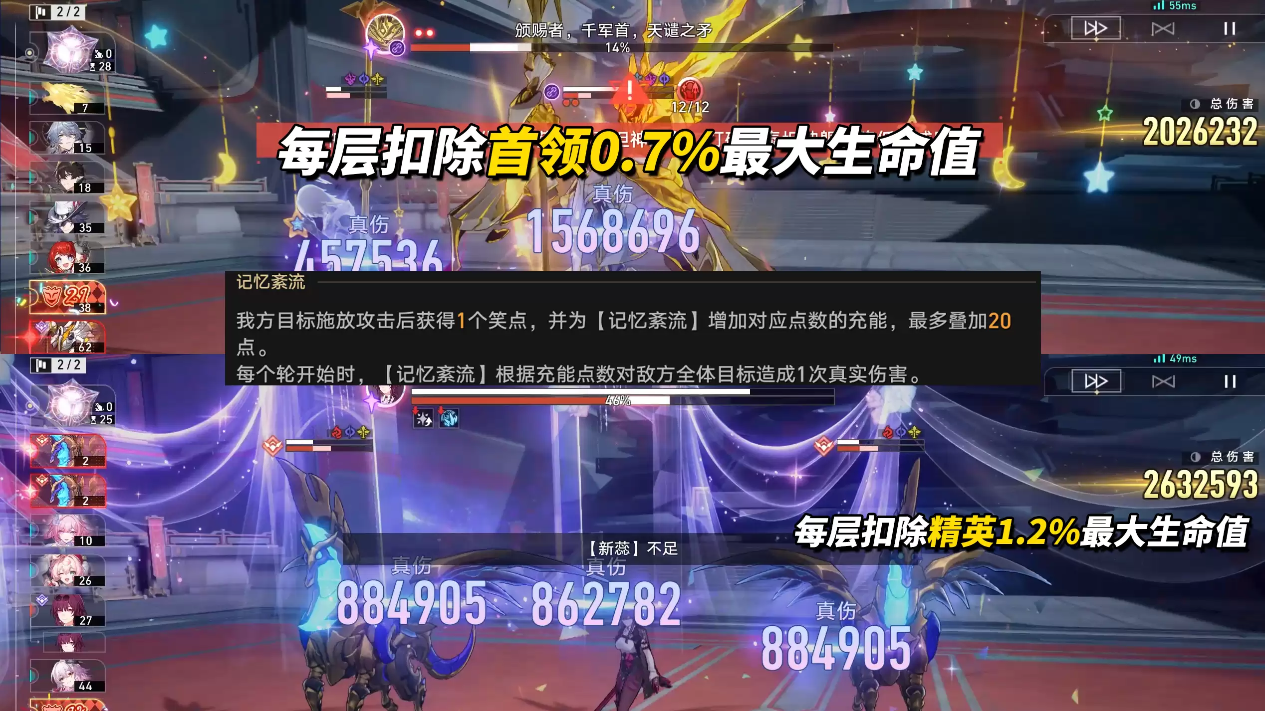 总体而言,本期混沌回忆的敌人生命值确实较高,若想挑战零回合(0T)极限,对队伍配置与角色练度要求颇为苛刻。然而,如果你的目标是稳定获取满星琼奖励,那么实际难度相当友好——请务必善用环境伤害,它已在无形中为你削减了海量的敌人血量。
