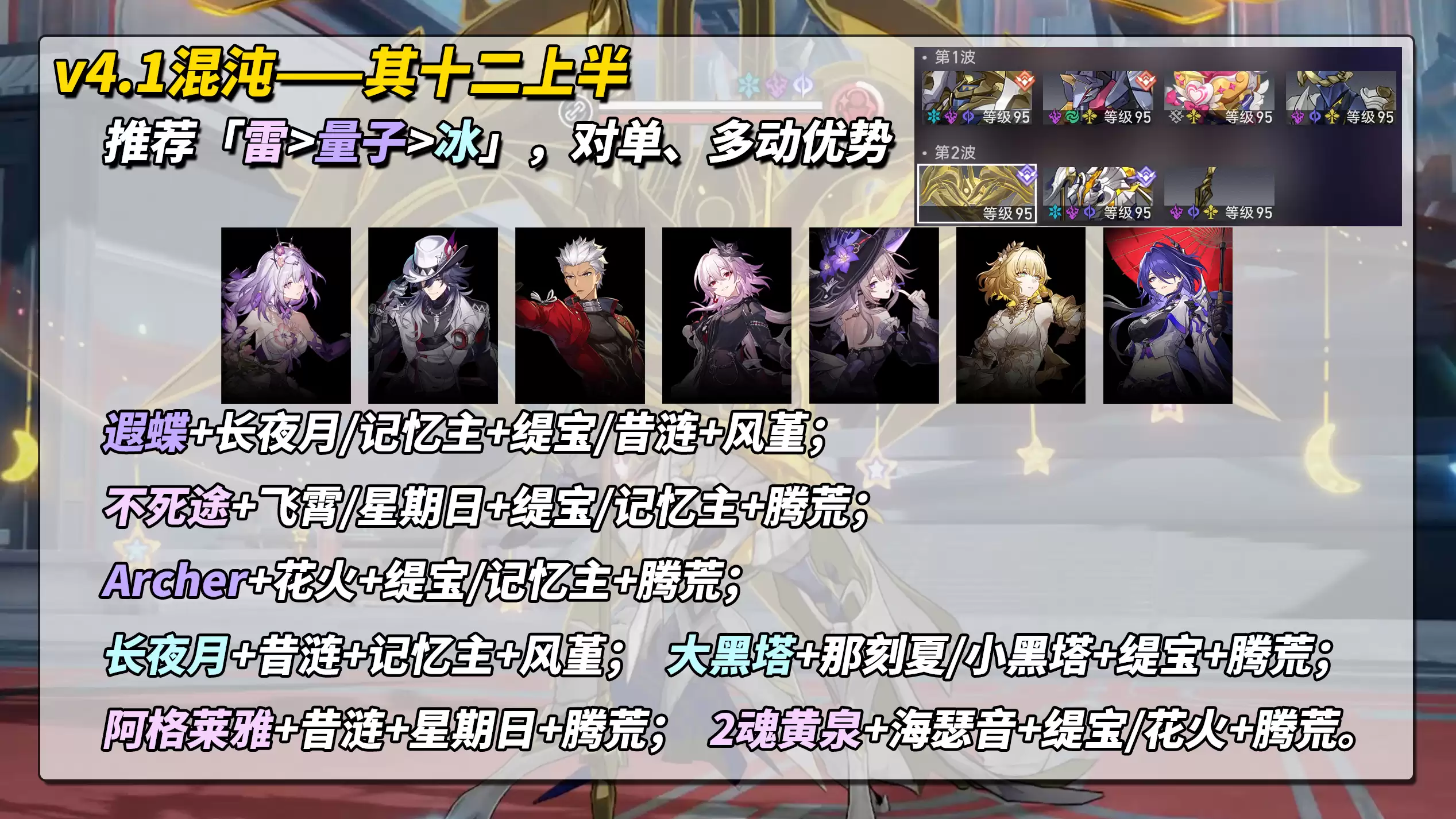 优势属性为「雷>量子>冰」。在队伍类型上,拥有出色对单伤害能力、且出手频率高的“多动队”将体验更佳。