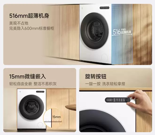 米家洗衣机滚筒10Kg超薄全嵌上架京东,专为嵌入式家居设计 近期,小米在京东平台上新了一款名为“米家洗衣机滚筒 10Kg 超薄全嵌”的产品。这款洗衣机主打适应全嵌安装的家居装修场景,目前定价为1199元。 从设计上看,这款产品采用了纯平一体的外观,机身厚度控制在了516mm。性能方面,其洗净比达到了