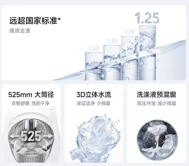从设计上看,这款产品采用了纯平一体的外观,机身厚度控制在了516mm。性能方面,其洗净比达到了1.25,这个数字远超国家标准的1.03,意味着清洁效能在基准之上。同时,它配备了525mm的大筒径,能提供更充分的摔打空间。洗涤程序也相当丰富,共有24种专属洗护模式,并依靠3D立体水流技术,宣称能够应对多达35种特殊污渍的清洗。