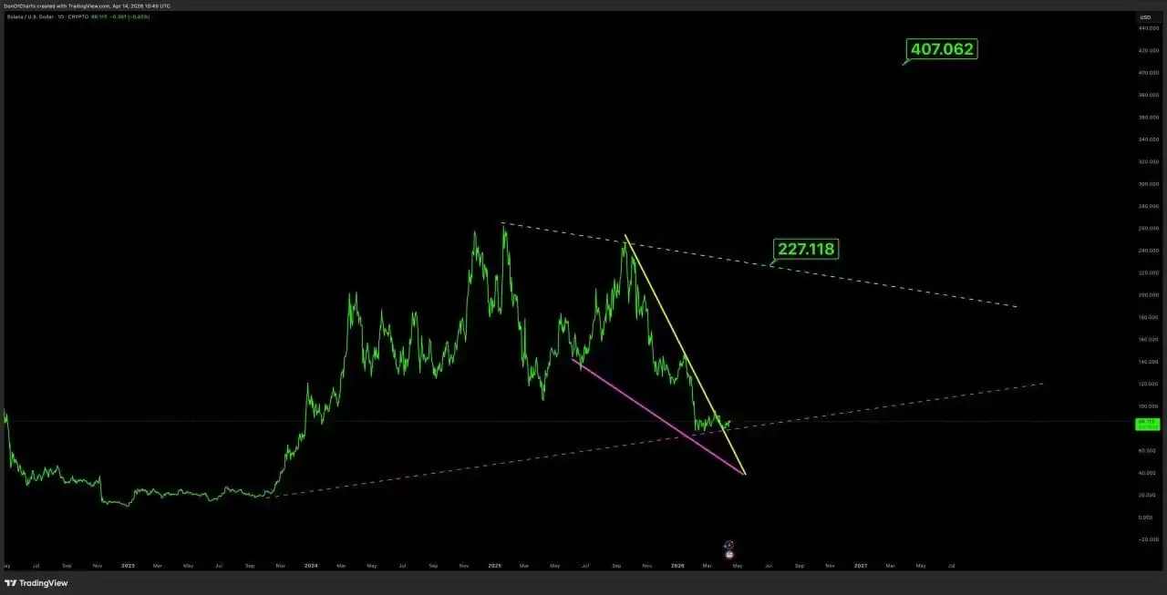 Don的分析指出,如果支撑位能够成功守住,索拉纳的价格有望实现300%至400%的惊人涨幅。图表上标注的长期目标价位甚至指向了407.06美元附近。这暗示着,一旦SOL成功突破下降趋势线并维持上涨动能,其上方空间将非常广阔。