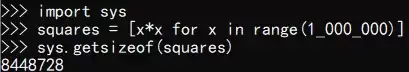 squares = [x*x for x in range(1000000)] # 占内存约8.06MB