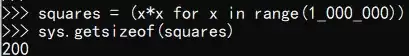 squares = (x*x for x in range(1000000)) # 内存占用极小,约200字节