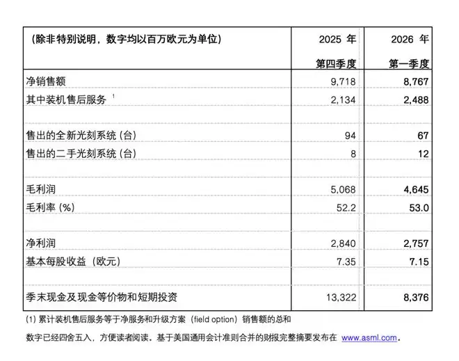 就在4月15日,ASML披露了其第一财季业绩。数据显示,公司期内实现净销售额88亿欧元,毛利率稳定在53.0%,净利润则达到了28亿欧元。这份成绩单本身已属稳健,但更值得关注的,是管理层对未来的判断。
