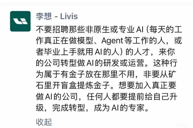 李想朋友圈发声:AI人才招聘,别在矿石里“开盲盒” 最近,理想汽车创始人李想在朋友圈分享了一段关于人工智能人才招聘的看法,观点直接,引发了业内不少讨论。 他核心表达了一个意思:企业在搭建AI团队时,应当谨慎招聘那些“非原生”的AI人才。这里说的“非原生”,指的是并非每天从事模型、智能体等核心AI工作