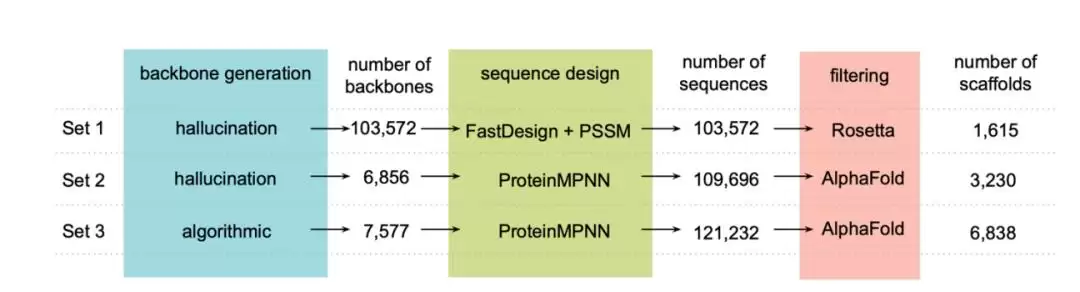 首先,他们采用了一种称为家族级“幻觉”的方法,生成了第一批共1,615个NTF2骨架结构。随后,利用ProteinMPNN工具为这些骨架重新设计氨基酸序列,并通过AlphaFold进行结构预测筛选,确保它们能稳定折叠成预设形状,从而得到第二个包含3,230个骨架的集合。为了进一步扩大多样性,团队还使用Rosetta软件参数化生成更多骨架,同样经过序列设计和AlphaFold验证,最终获得了第三个包含6,838个骨架的集合。整个过程如下图所示: