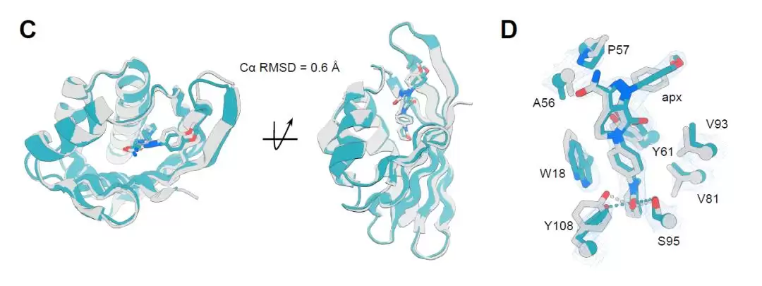 眼见为实。为了验证设计的准确性,团队解析了两个蛋白质-配体复合物的晶体结构:结合皮质醇的hcy129和结合阿哌沙班的apx1049。